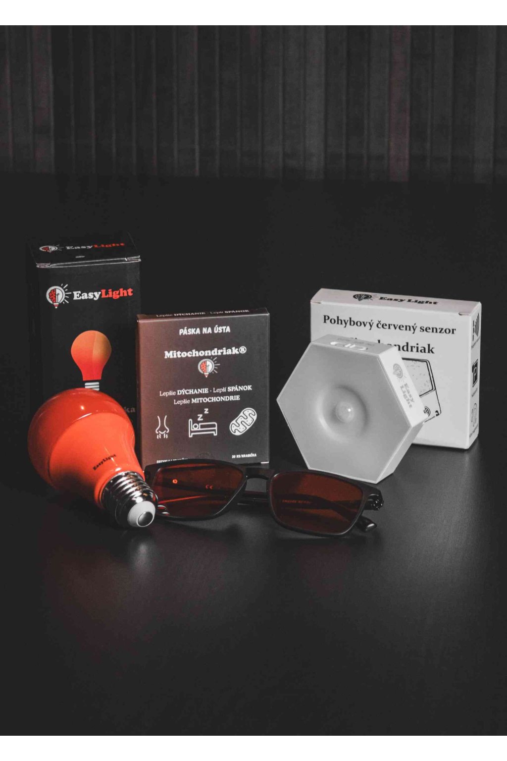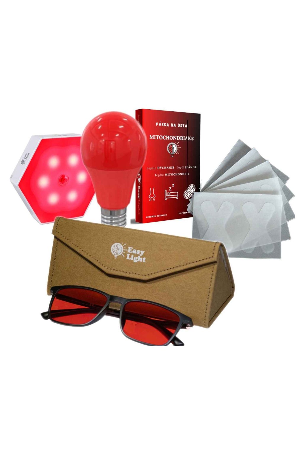 Dzięki zestawowi Mitochondriak® STARTER otrzymasz wszystko, co podstawowe i niezbędne do lepszego snu oraz optymalizacji środowiska świetlnego. W zestawie znajdziesz czerwone okulary przeciwko niebieskiemu światłu, nocne czerwone światło z czujnikiem ruchu, czerwoną żarówkę E27 oraz 30 szt. taśm na usta przeciw chrapaniu. Załóż okulary 90 minut przed snem, używaj żarówki lub czujnika jako oświetlenia wieczornego, a taśmę na usta naklej tuż przed snem. Proste, prawda?